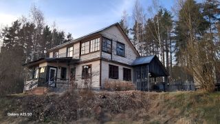Дом удобно расположен на возвышенности, что открывает великолепный вид на окрестные просторы и лес, а также на живописное озеро — идеальное место для уединения и наслаждения природой.