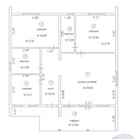 прихожая, большая кухня-гостиная с выходом на террасу, 3 спальни, сан.узел, котельная.