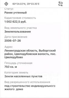 Предлагается в продажу земельный участок, идеально подходящий для любителей рыбалки. Расположенный в тихом и уединенном месте п.Цвелодубово ул.Зеленая, вблизи озера Нахимовское, до пирса 5 мин. пешком, пляж 10 мин. Участок имеет площадь 7,5 соток что позволяет разместить небольшой дом, баню или беседку, а также организовать уютный уголок для отдыха. Эл-во 15 КВт, вода центр.водопровод. Участок расположен на высоком месте, правильной формы, не разработан. Межевание сделано. ИЖС аренда 49 лет( с правом выкупа 3% от кадастровой стоимости участка после оформления дома в собственность).Кадастровый номер: 47:01:1532001:377. Видео по запросу.