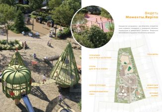 Ландшафтный дизайн с арт-объектами, спортивные и детские площадки, велопарк, теннисный корт.