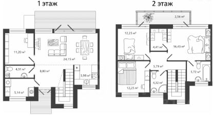 Просторная кухня-гостиная до 40 м², 3 спальни на втором этаже (включая одну мастер-спальню), кабинет, гардеробные, возможность установки сауны.