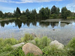 Участок разработан, по контуру проходит дренажная канава, установлен забор. На участке растут яблони, слива, вишня,кусты смородины, крыжовника, голубика.