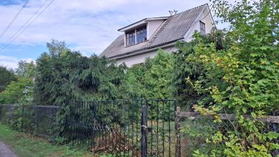 На участке в 16 соток стоит двухэтажный дом из бетонных плит, деревянный гриль-домик и летний гостевой дом, выкопан пруд и течет ручей.