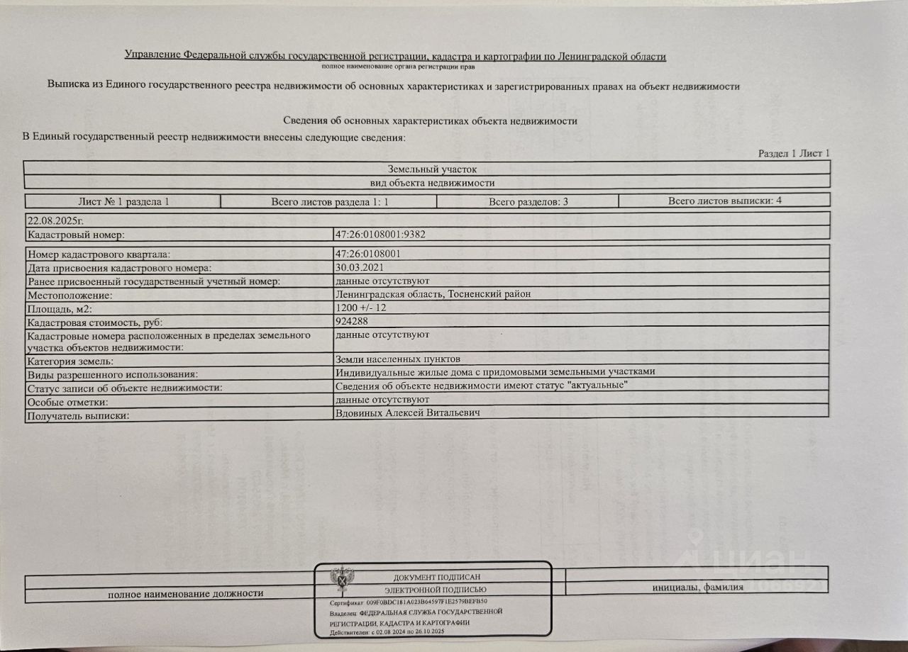 Кадастровый номер 47:26:0108001:9382.Площадь 12 соток.