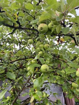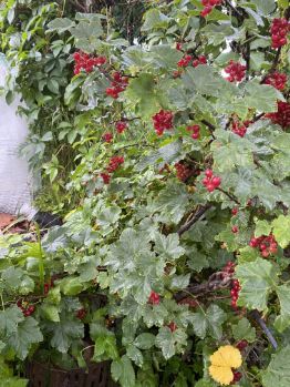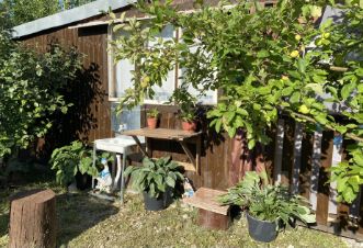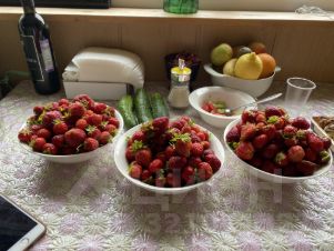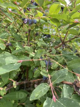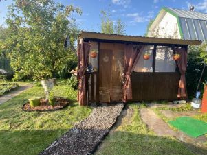 Плодовые деревья, кустарники разные, много молодых посадок (2-4 года), парники, много клубники, грядки с автополивом. Сосны, туя.