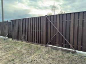 Участок огорожен с двух сторон забором из деревянного штакетника, есть откатные ворота и калитка.