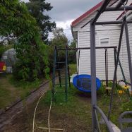 Второй дом установлен на железных сваях и имеет площадь 36 метров, одноэтажный. В доме три комнаты, каждая по 9 метров. Электричество к дому подведено.