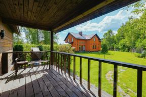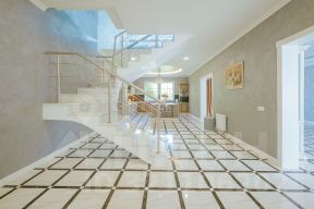 • На втором этаже — четыре спальни (в двух из них есть совмещённый санузел с душевой и гардеробной), большой холл и балкон. Лестница выполнена из мрамора.