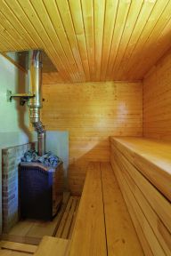 • На первом этаже расположены кухня, гостиная, две комнаты, прачечная, душевая, санузел, сауна, две гардеробные и котельная.