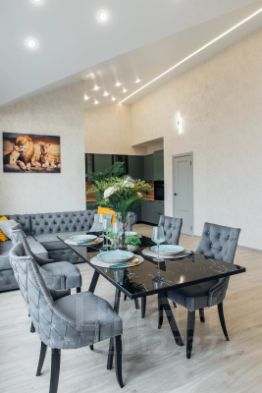Просторная кухня-гостиная со вторым светом площадью 39 м2, высотой потолков более 4 метров и панорамным остеклением. Шикарный вид из окон.