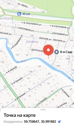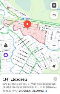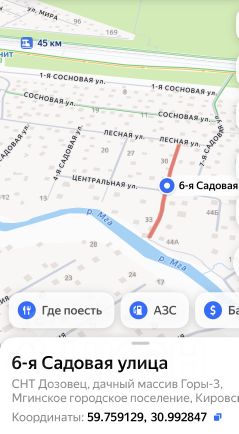 Сама территория участка размером 5,7 сотки. Участок на первой линии реки Мга (20 метров). Участок имеет наклон. Всегда сухой, вода не скапливается. На участке парник, грядки с плодородной землёй, плодовые деревья, кусты смородины и крыжовника и т.д.