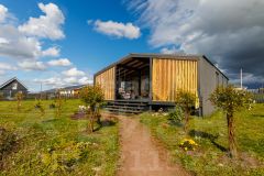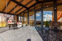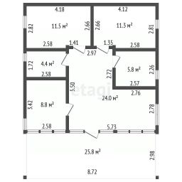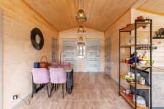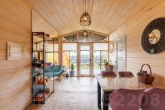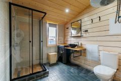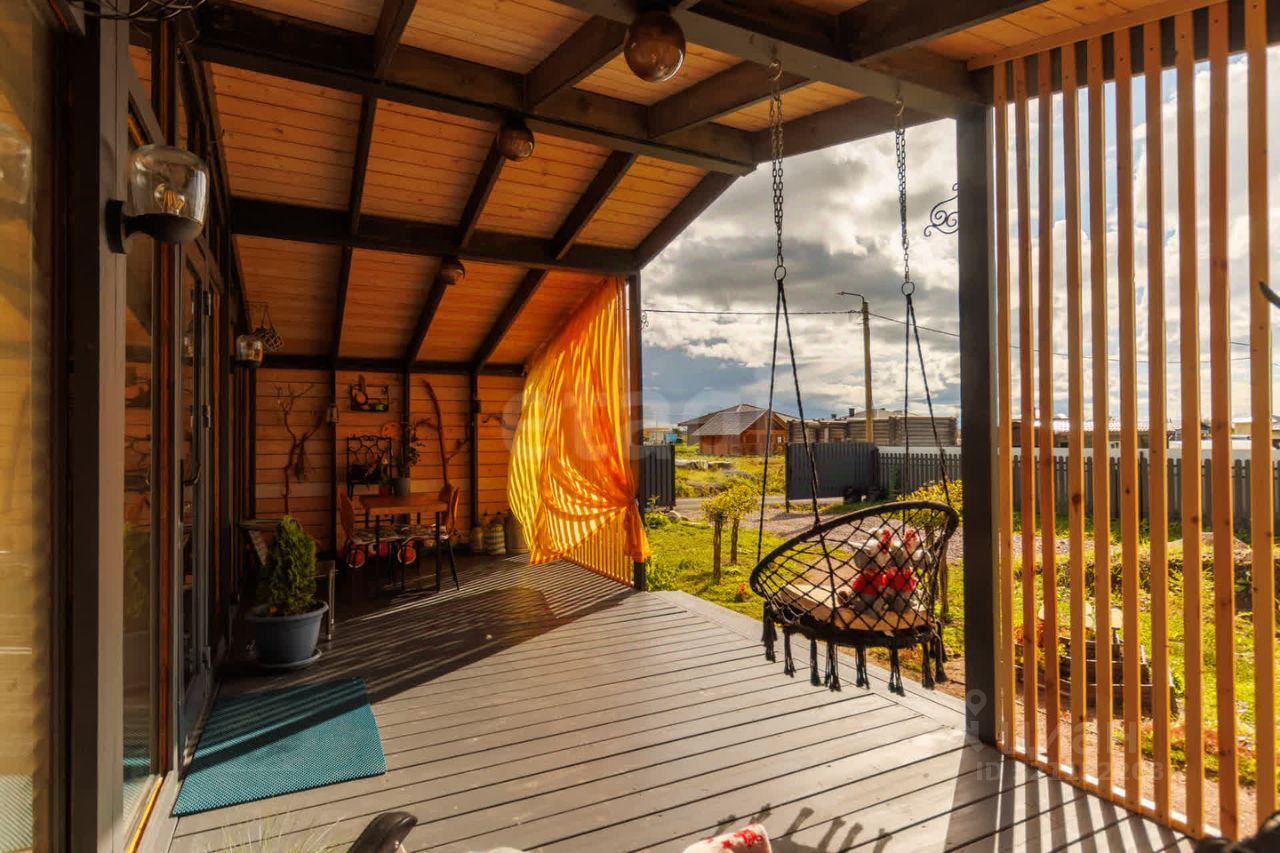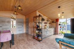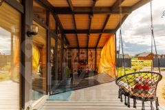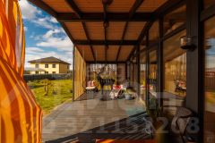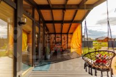 Имеет функциональную планировку большая кухня гостиная 24 м , с панорамным остеклением и с высотой потолка в коньке 3м . Три комфортные спальни 11.5 м , 11,3м , 8,8 м,. Гардеробная 4,4 м . Изюминка дома терраса 27 м с неповторимыми закатами !