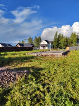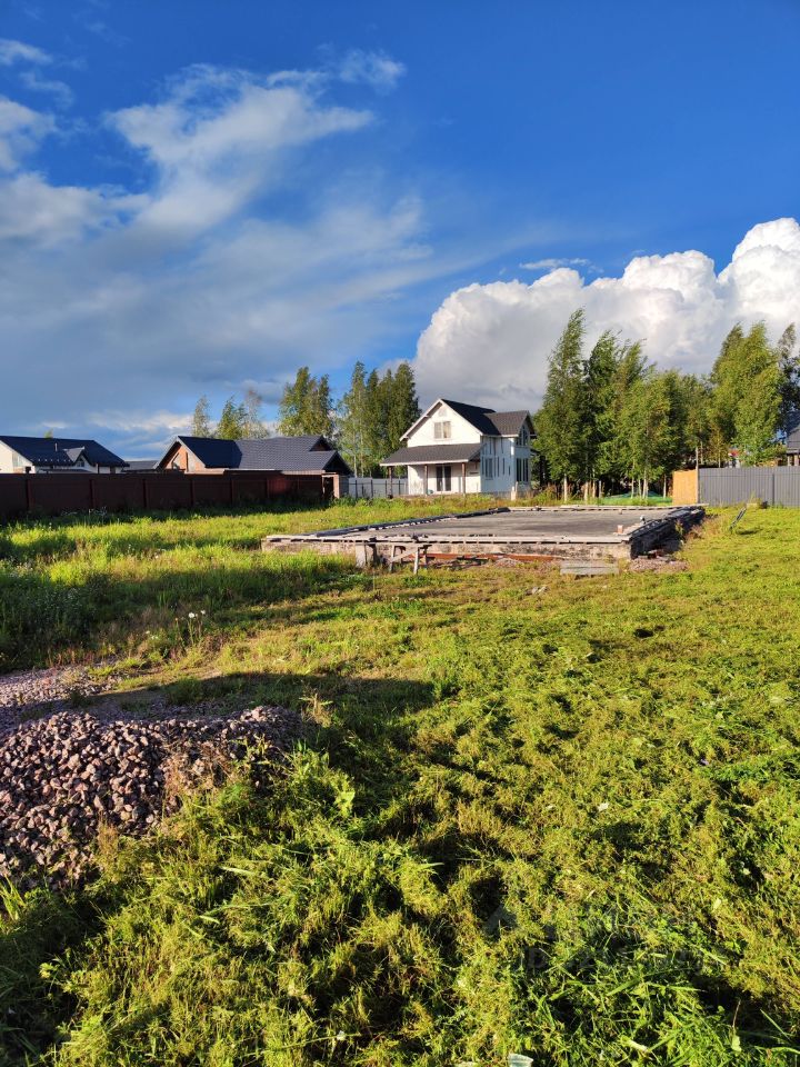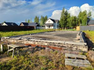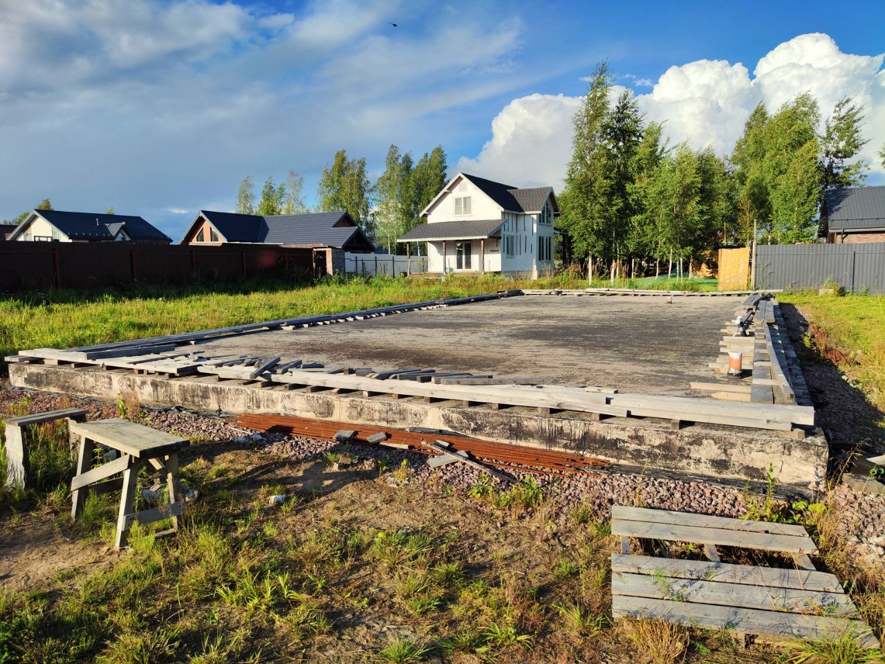 На участоке стоит фундамент для строительства дома, монолитная жб плита 300 мм, площадью 153 м2. Для строительства есть два разных проекта, под газобетон и под арболитовые панели. Участок сухой и ровный.