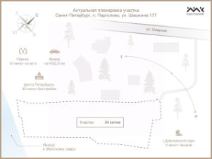 Участок прямоугольной формы расположен на небольшом возвышении, что обеспечивает живописные виды и защиту от подтопления. Есть прямой выход к Финскому озеру с возможностью купания и рыбалки, рядом песчаный пляж.