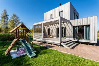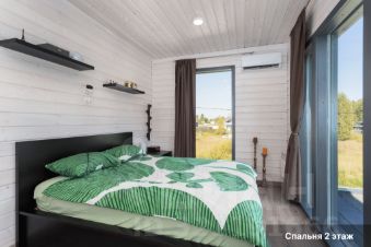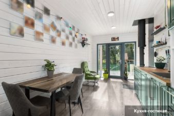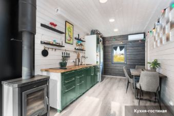 В модульном двухэтажном доме от компании HoltsovHouse планировка продумана до мелочей и максимально функциональна. На первом этаже просторная кухня площадью 16,5 кв.м с дровяным камином. Благодаря панорамному остеклению открывается прекрасный вид на участок. Здесь есть выход на просторную террасу, где можно проводить время в кругу семьи и друзей. Также на первом этаже размещены две гостевые комнаты по 8 кв.м. и санузел с ванной.