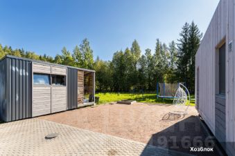 На участке площадью 11 соток сформирован красивый ландшафт: ровный рельеф, тротуарная плитка вокруг дома, дорожки, засеян газон и парковка на два автомобиля. Также на территории установлен стильный хозблок, который идеально подходит для хранения личных вещей и инвентаря.