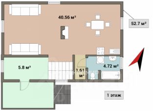 1 этаж: прихожая, просторная кухня-гостиная (кухонный гарнитур новый, никогда не использовался), совмещенный санузел (установлен водонагреватель и стиральная машина). Есть возможность обустройства кладовой.