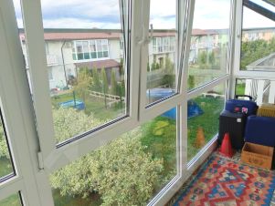 Двухэтажная квартира - евротрёшка с большой просторной кухней-гостинной 27,48 кв.м., высота потолков 2,91м на 1-ом этаже, на 2-ом этаже две изолированные комнаты 12+12,55 кв.м. высота потолков 3,56-2,7м, из обеих комнат выход на застеклённый балкон 4,7 кв.м., окна и балкон с видом на сад, на обоих этажах сан/узлы по 3 кв.м., душевая на 2-ом этаже.