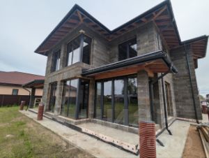 - стены дома на основе щепоцементных блоков несъемной опалубки (по австрийской технологии), экологически чистый продукт с уникальным сочетанием конструктивных и потребительских свойств, уже с утеплением + единый монолитный каркас дома + вертикально и горизонтально арматура в цементе;