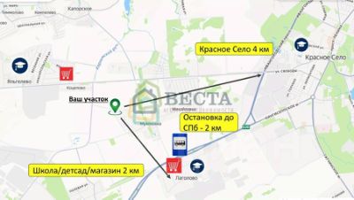 Всего в 2-2.5 км находятся остановка с автобусами до Санкт-Петербурга, школа, детский сад, сетевые магазины, и вся необходимая инфраструктура п. Лаголово. Ближайший сетевой магазин "Магнит" в 2 км. Также рядом инфраструктура г. Красное Село, п. Яльгелево.