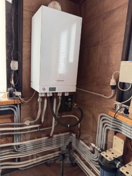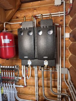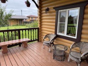 Гостевой дом (оцилиндрованное бревно 22 см) с дровяной русской баней и купелью имеет все условия для круглогодичного пребывания: камин, теплые водяные полы, радиаторы отопления, горячая вода. Установлен котел Viessmann с SIM-картой для дистанционного управления с помощью мобильной связи. Фундамент бетонный ленточный. Высота потолков в жилых комнатах на 1 этаже- 3 метра.