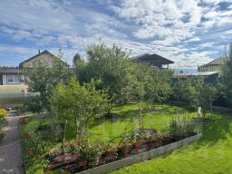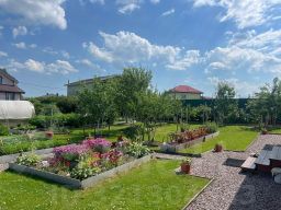 * Для урожая и хобби: много цветов, плодовый сад (яблони, груша, алыча, слива, орешники), ягодные кусты (жимолость, смородина, малина, крыжовник, клубника, виноград), грядки для овощей и две просторные теплицы. Всему есть свое место: для инвентаря, дров и техники построены аккуратные хозблоки в разных частях участка.