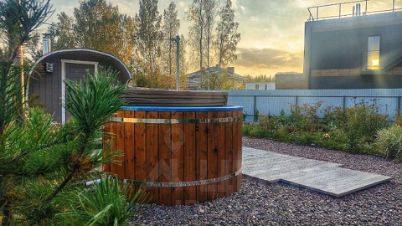 Для полноценного отдыха оборудована баня-бочка, а рядом - купель с подогревом и подсветкой, где можно расслабиться и восстановить силы в любое время года.