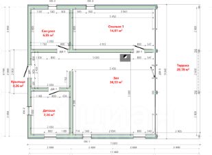 Жилая площадь 67 м² + 26,8 м² крытая терраса. Кухня-гостиная 30,2 м², спальня 14,9 м², детская 7,6 м², с.у. 6,7 м², прихожая 6,3 м².