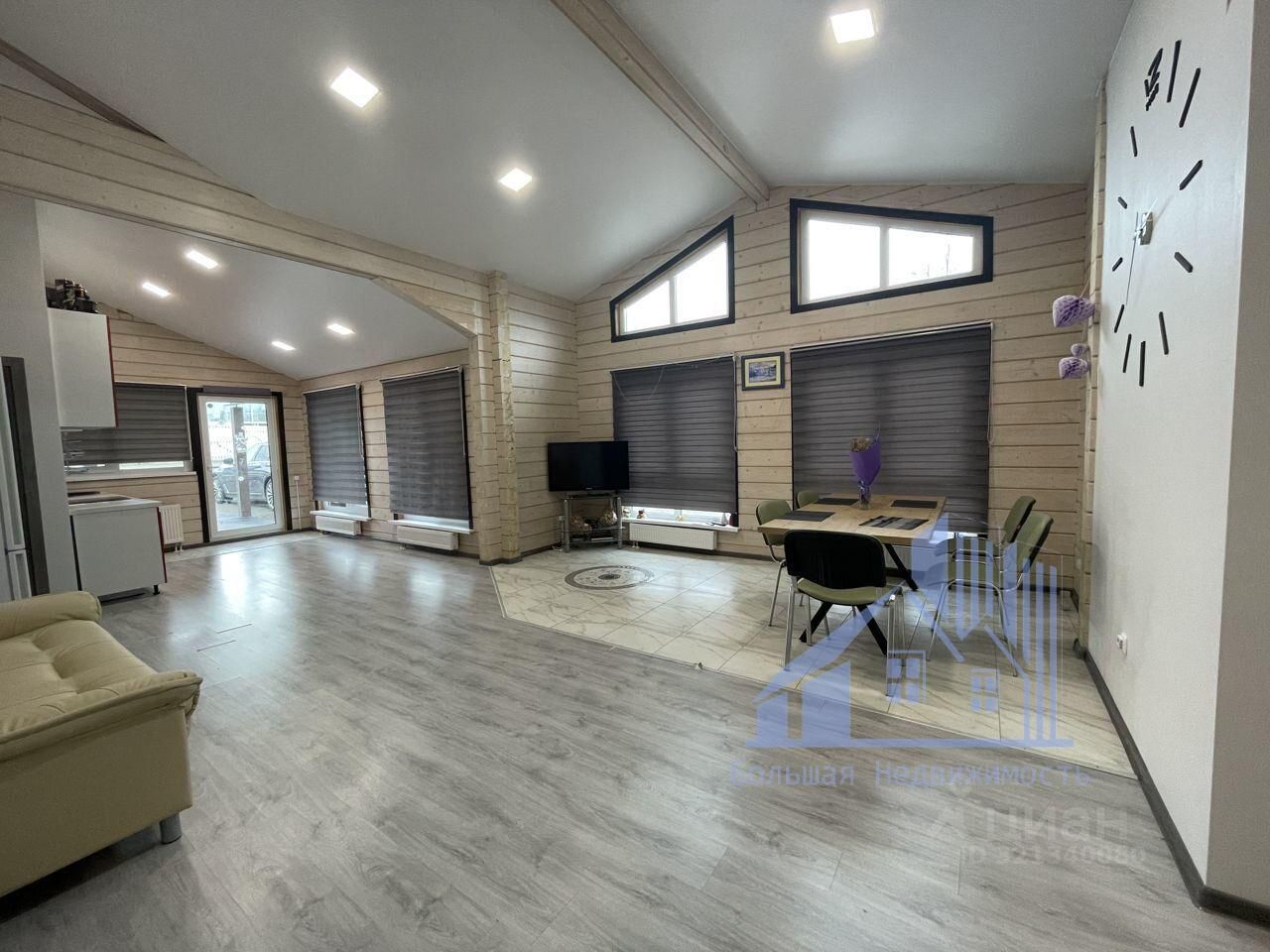 просторная кухня-гостиная с высокими потолками и панорамными окнами.