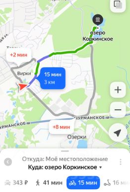 До Коркинского озера 2 км по просёлочной дороге проезд на велосипеде, так же занимает минут 15.