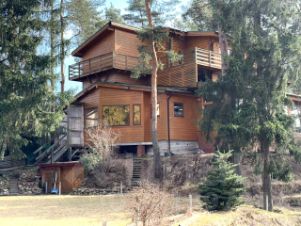 Дом на возвышенности-прекрасный вид, сосны и ели, река, чистый воздух, пение птиц. Однородная социальная среда. На участке дополнительно автономная жилая постройка- 193.9 м2-комплекс: бассейн, помещение для отдыха , сауна, жилое помещение(для изолированного проживания родителей или взрослых детей), с/узел ; гараж на 2 машины.