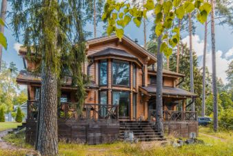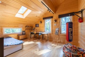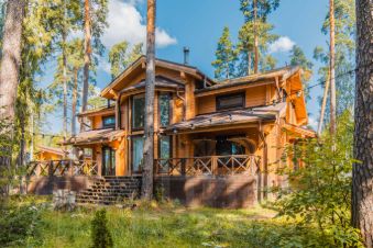 Дом площадью 293.7 м2, расположен на рельефном участке 15.33 соток. Кроме дома на участке хозблок для спортивного и садового инвентаря. На участке остается место для бани или других построек, которые можно вписать среди деревьев.