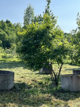 На участке растут несколько деревьев и плодово-ягодные кусты.