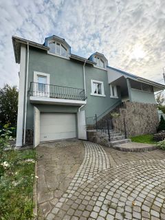 3 этажа с полноценной мансардой с балконом, колоннами белого цвета , строился для себя качественными материалами. Ограждения балкона и лестничная площадка выполнены из металлической решетки с орнаментом.