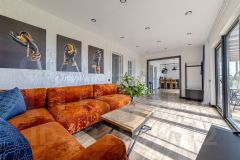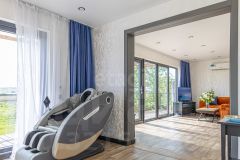 Главный дом оснащен сауной с возможностью управления через голосового помощника "Алиса", как и вся система освещения и отопления. Технология "умного дома" позволяет дистанционно контролировать климат, включать кондиционеры или автоматические шторы через смартфон. В комплектацию входит мебель, бытовая техника и продуманный дизайн интерьера, что избавляет от необходимости дополнительных вложений после покупки. В качестве бонуса — новое массажное кресло.