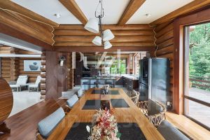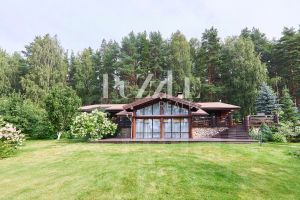 Просторный одноэтажный дом площадью 412 кв. м обладает максимально продуманной планировкой. Общая пространство дома условно поделено на две независимые части. Обеденная зона объединена с кухней и имеет выход на солнечную террасу. Панорамные окна объемной гостиной наполняют помещения светом и предоставляют захватывающий вид на гладь озера, что создает ощущение единства с природой. Правое крыло дома отведено под уютные три спальни , включая мастер зону.