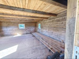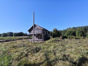 Объект представляет собой капитальное строение с выполненной коробкой дома под крышей, что позволяет новому владельцу сосредоточиться на внутренней отделке по индивидуальному проекту. Конструктивные особенности включают ленточный фундамент, возведенные стены из бруса и кровлю из ондулина. Электрический столб стоит на границе участка.