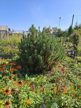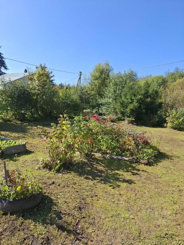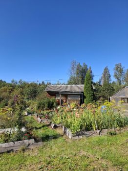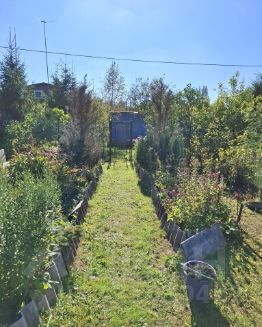 Участок угловой, ухоженный. Много цветов, плодовых деревьев и кустарников. А еще вас будет радовать урожаем черный виноград, растущий на участке.