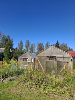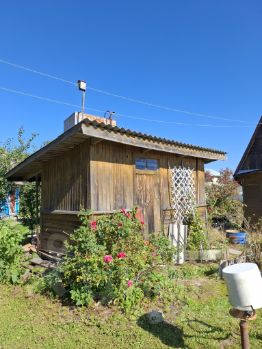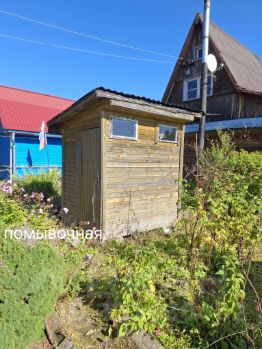 На ухоженных 9 сотках земли расположился небольшой домик(вагон-бытовка с пристроенной террасой), сарай, душевая-помывочная, 2 теплицы.