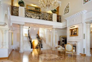 Стены - венецианская штукатурка из Италии и экологичные обои из Франции. Полы - наборный художественные паркет и итальянская плитка. Потолки от 3 до 8 м. В гостиной великолепный второй свет. Двери - массив с инкрустацией, из Италии.