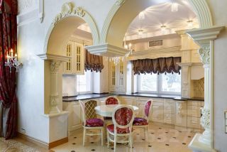 Кухня - Neff kitchens из Канады, массив американского клена. Вся бытовая техника: панель, духовка, ПММ, СВЧ, холодильник от Miele. Просторная гостиная создана в пастельных тонах, в классическом виде, с ажурной подсветкой, с колоннами из цельного мрамора и картинами на стенах. Мягкая мебель и телевизор.