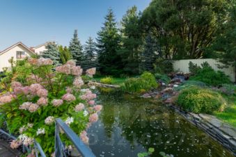 На участке сформирован ландшафтный дизайн, выполнена гармоничная уличная подсветка, проложены дорожки из брусчатки. В озеленении использованы элитные виды растений, кустарников и деревьев. Реализована система автоматического полива. Есть свой собственный респектабельный пруд с золотыми рыбками, с фонтаном и водопадом. На острове пруда установлена закрытая беседка с зоной барбекю. На входе в усадьбу оборудован функциональный большой дом для собаки:). Детская площадка расположена за задней стороной дома, оборудована качественным мягким покрытием, горкой, качелями и прочими детскими атрибутами.