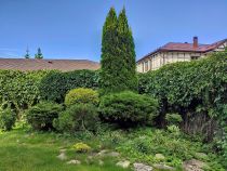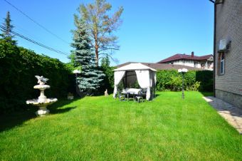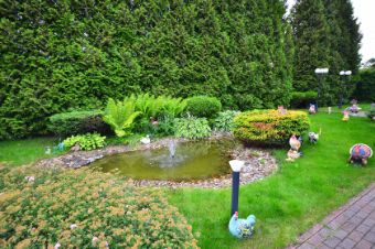 Участок утопает в зелени, ухожен, на его территории посажено множество деревьев, кустарников и цветов, есть несколько локаций для отдыха (качели с видом на фонтан, декоративный бассейн с фонтаном и беседка с мангалом).