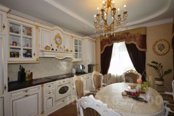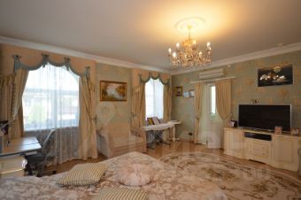 В коттедже выполнена дизайнерская отделка высококачественными материалами, вся мебель и кухонный гарнитур - производство Италия, камин открытого типа в аристократическом английском стиле привезенный из Англии, дубовая лестница и паркетный пол с элементами мозаики, перила кованные, двери- массив, производства Италия, вся бытовая техника Miele, сантехника от надежного и качественного производителя, посуда и вазы Карина производства Чехия.