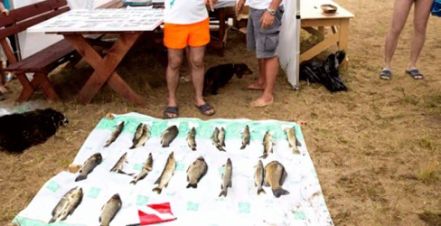 На фото показан улов подводной рыбалки на озере Копанское в 2015 году.