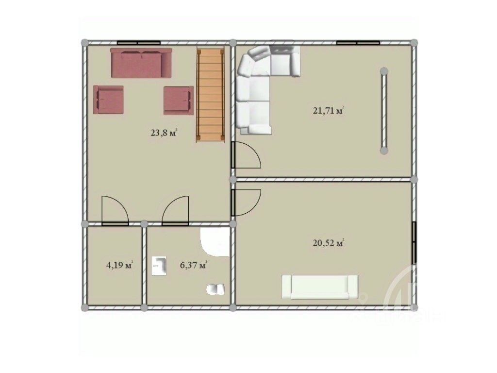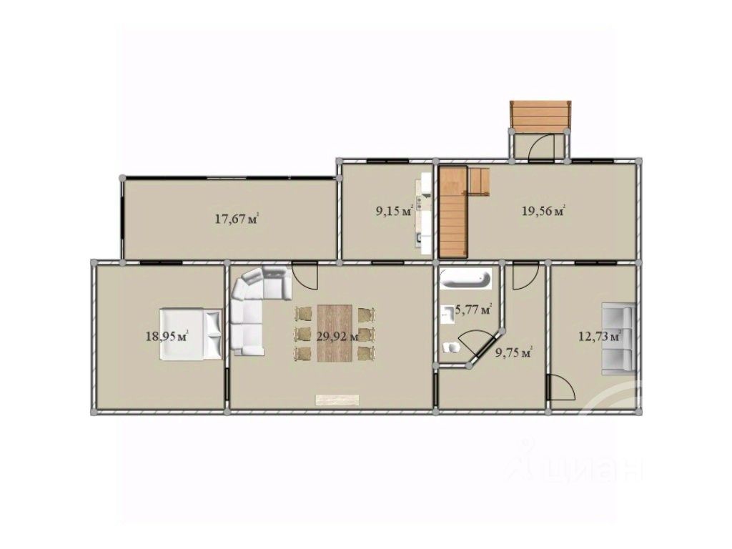 Два этажа, пять комнат, одна из которых просторная уютная гостиная с камином. Есть большая терраса с выходом на участок.