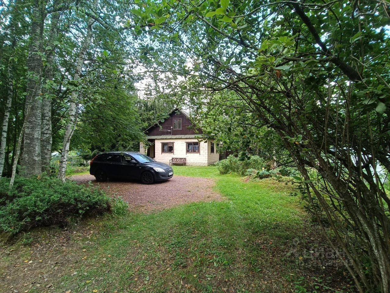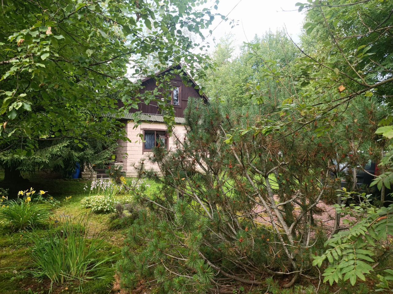 Участок ухоженный, есть грядка с клубникой, раньше также выращивали овощи, сейчас на участке газон, ели и деревья. Есть площадка для парковки 2-3 автомобилей.