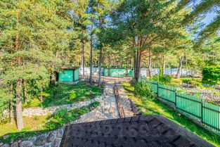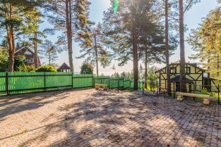 Участок ухожен: сосны, ландшафтный дизайн, дорожки вымощены плиткой.