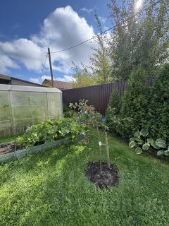 Произведен дренаж участка, оборудована парковка на 4 а/м. Посажены фруктовые деревья и кустарники.