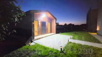 •Место для загара, брусчатка выложена впереди всего дома, туи, ночное освещение дома, балкона, ночное освещение территории
